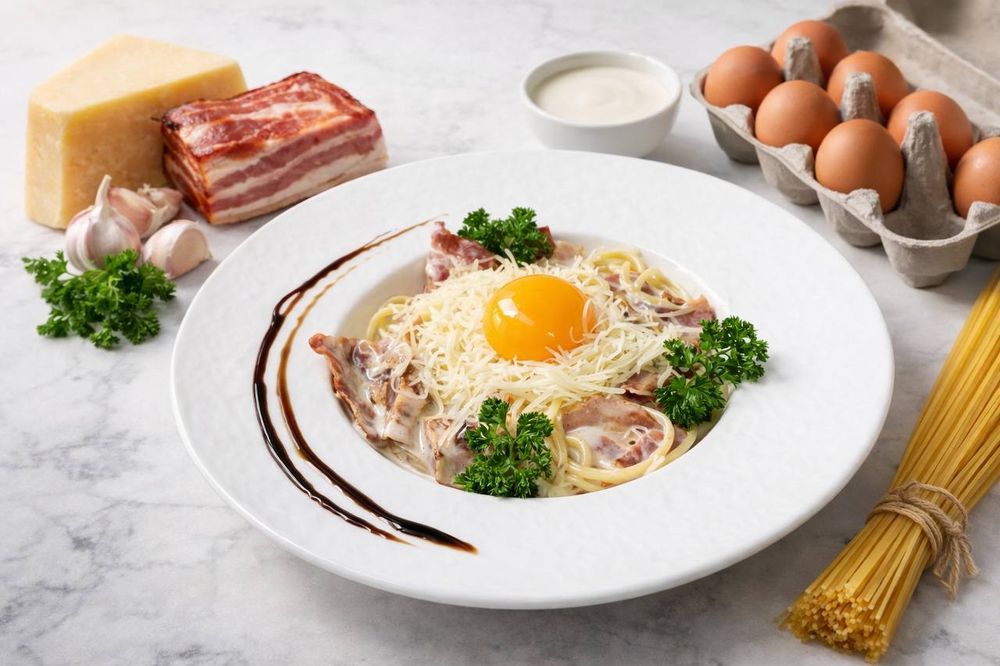 Спагетти, бекон, сливки, чеснок, пармезан, специи