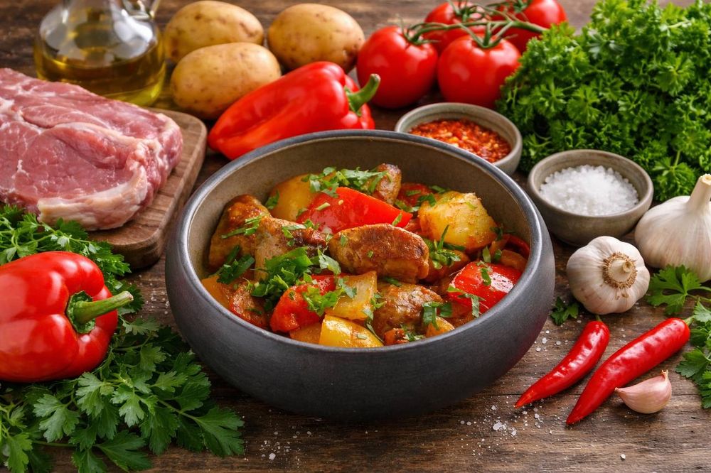Свинина, картофель, лук, болгарский перец, помидор, чеснок, специи, зелень