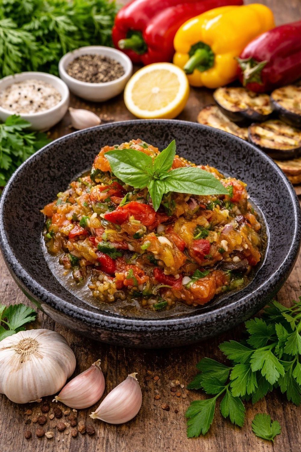 Баклажан, болгарский перец, помидор, красный лук, специи, масло, сок лимона, зелень