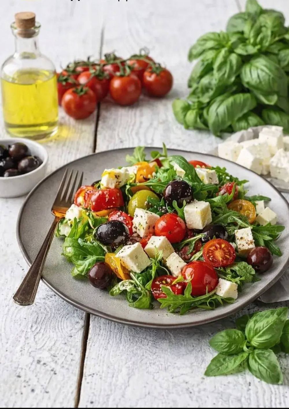 Помидор, романо, болгарский перец, огурец, маслины, Фета, красный лук, оливковое масло