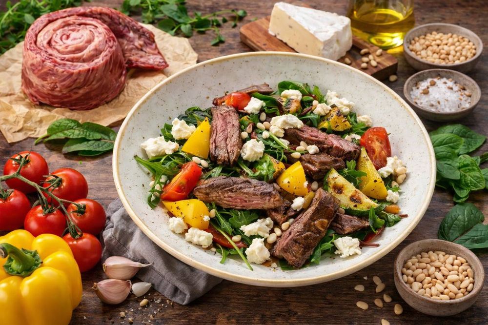 Говядина, болгарский перец, черри, руккола, творожный сыр, кедровый орех, соус Унаги