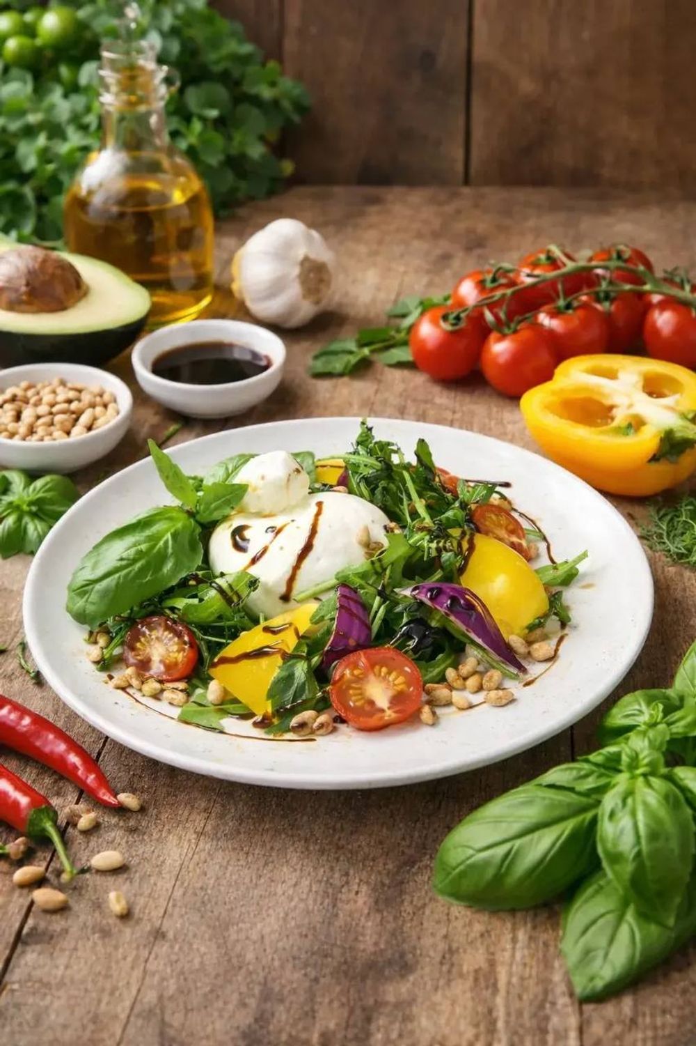 Буррата, руккола, черри, бальзамик, кедровый орех, болгарский перец, красный лук