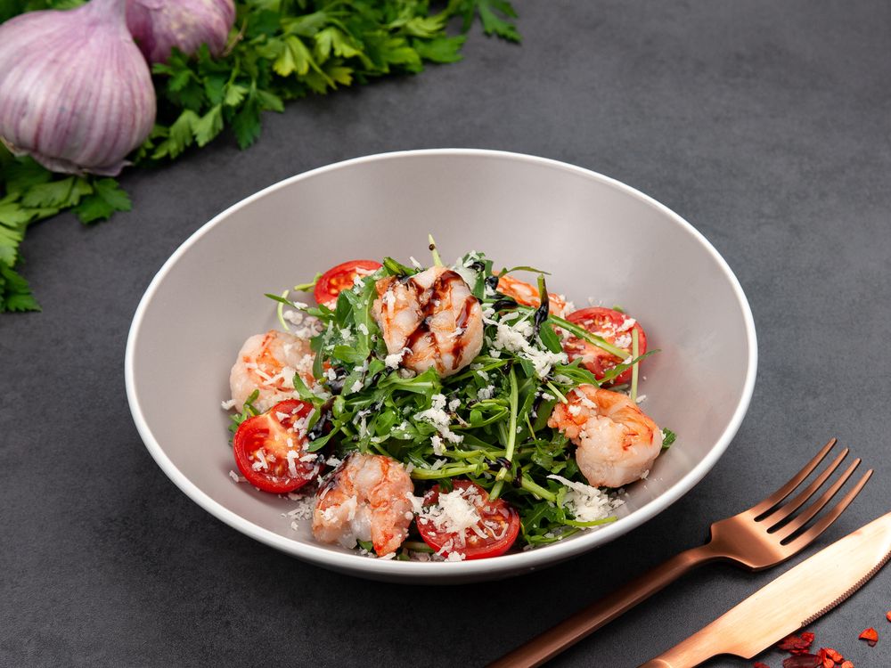 Руккола, креветки, апельсин, зеленое яблоко, черри, Пармезан, бальзамик, оливковое масло, кедровый орех