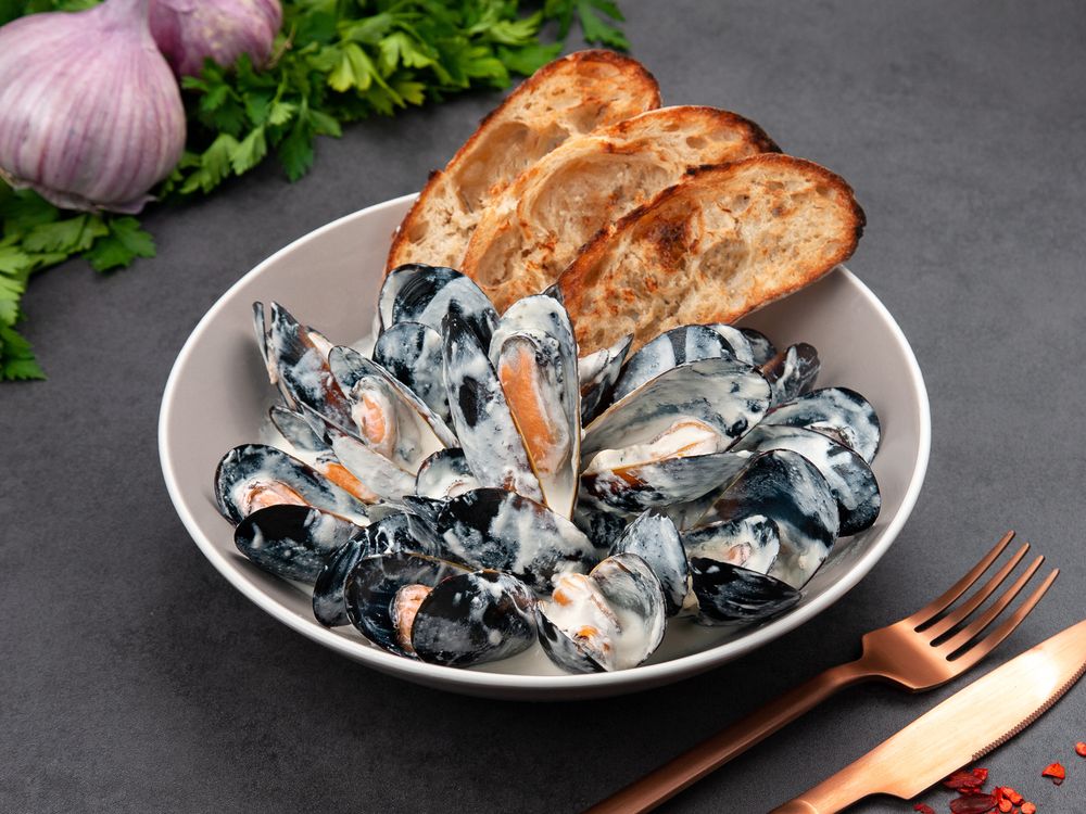 Мидии, сливки, пармезан, горгонзола, чаибатта