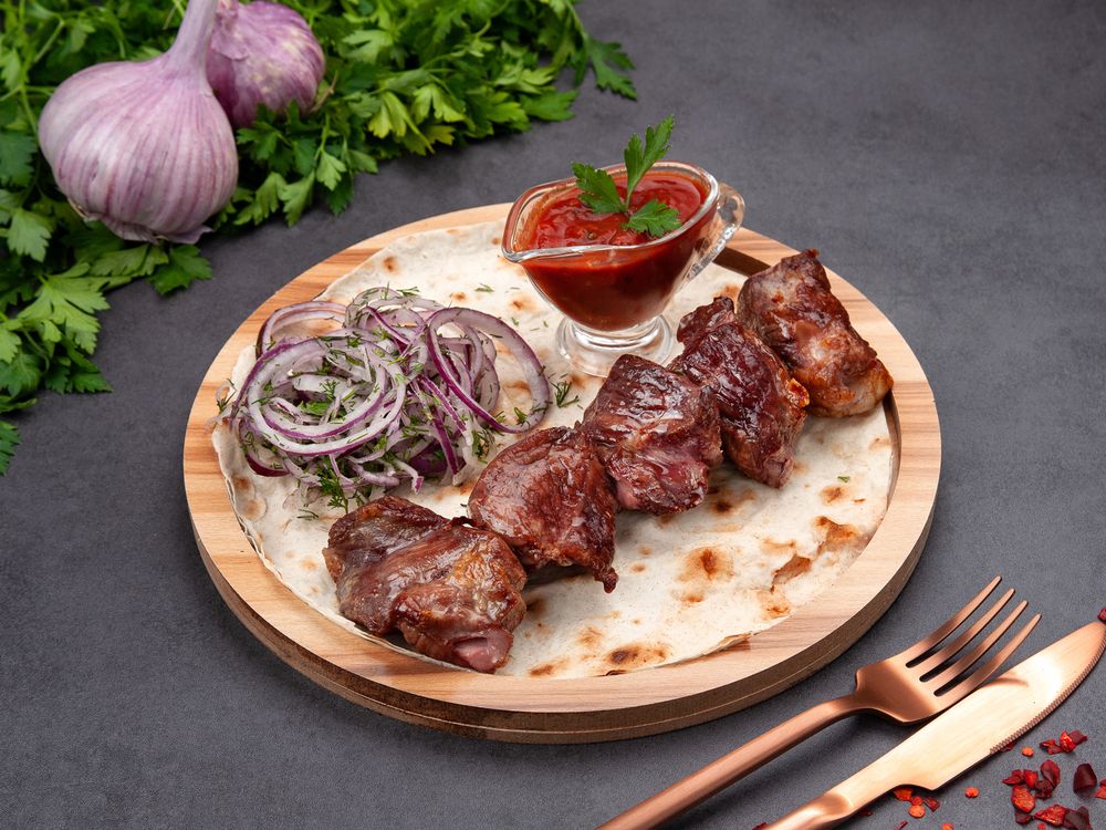 Баранина мякоть, лаваш, лук, соус томатный, специи