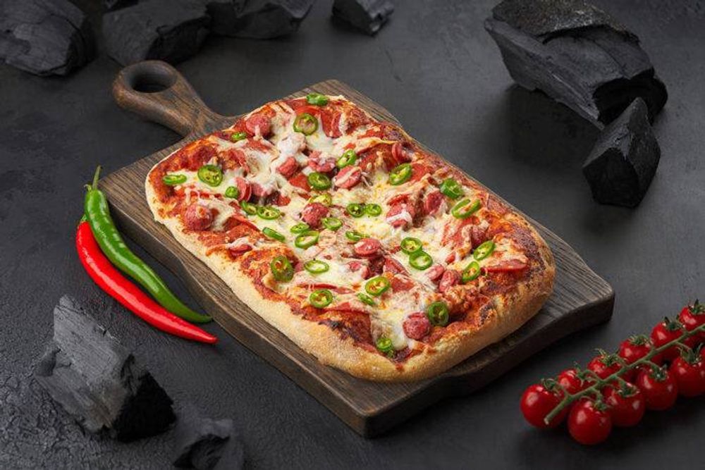 Соус томатный, моцарелла, курица, пепперони, бекон