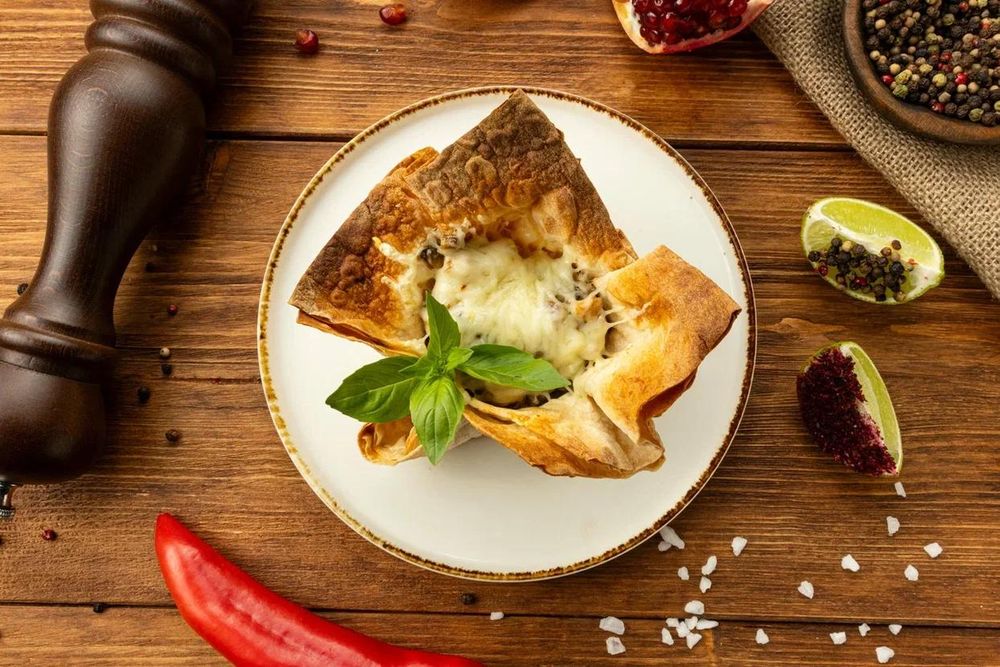 Лаваш, грибы, сливки, курица, лук, базилик, пармезан
