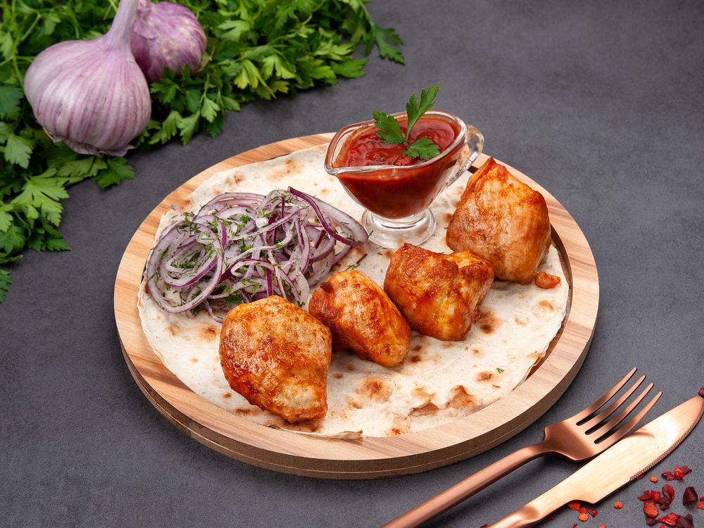 Курина грудка, лаваш, лук, соус томатный, специи