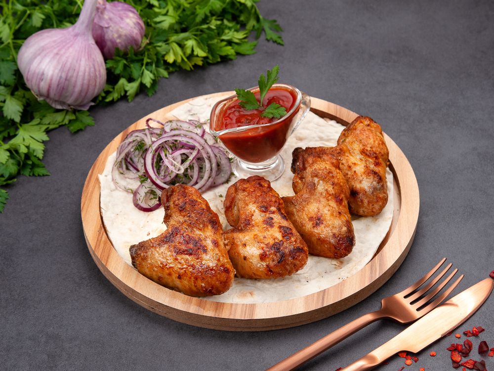Куриное крыло, лаваш, лук, соус томатный, специи